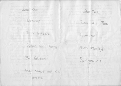 Someone organised another concert in May 1973. It could have been me and others. I can’t remember. However, Lonene performed again - Paul Gateshill, Tracey Coles, Dave Cledwyn and myself. So too did Nick Kahn and Mick Daysh, but now with Jackie White (previously with Lonene); and the Andy Vores band, which incorporated folks promiscuously from other bands and elsewhere. Kathy and Rosalind Russell also made a reappearance after long absence. New performers included PINT (among whom were my brother Ivor Bundell) and Tarsus (Chris Nash, Mark Luckham and Andy Sandham ).